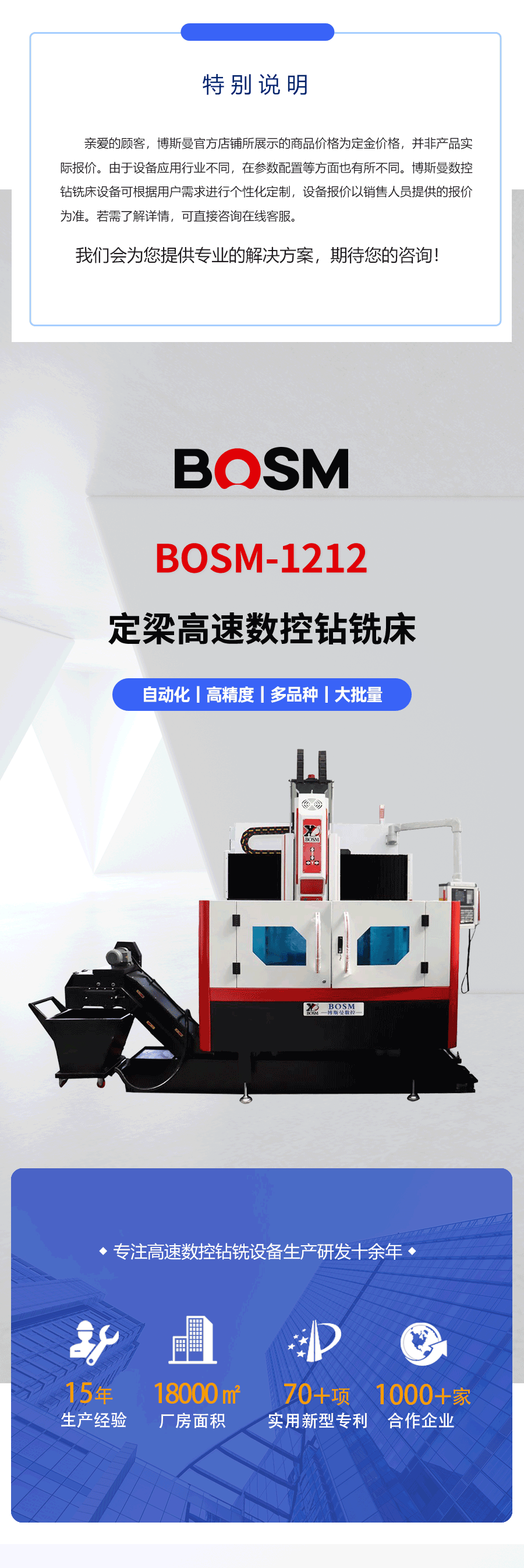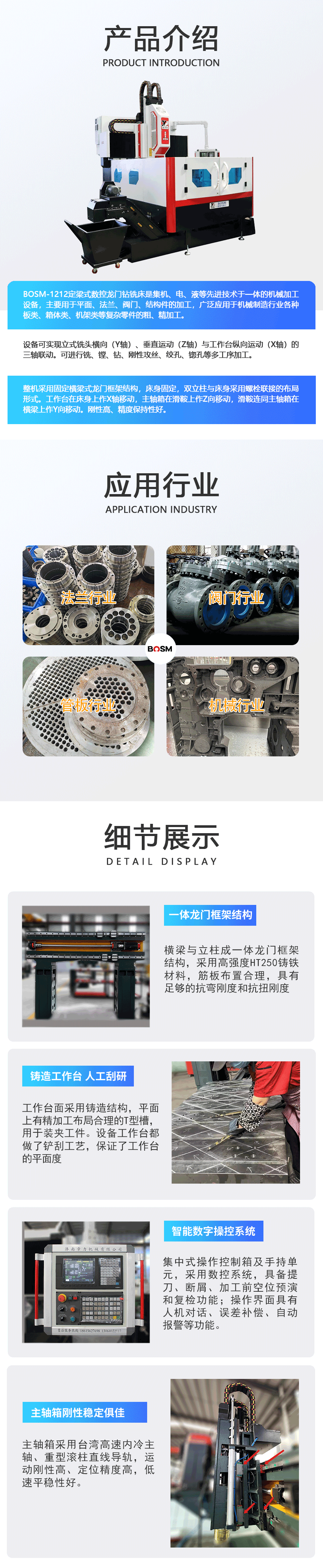 BOSM-1212定梁式數控龍門鉆銑床是集機、電、波等先進技術于一體的機械加工設備,主要用于平面、法蘭、閥門、結構件的加工,廣泛應用于機械制造行業各種板類、箱體類、機架類等復雜零件的粗、精加工,